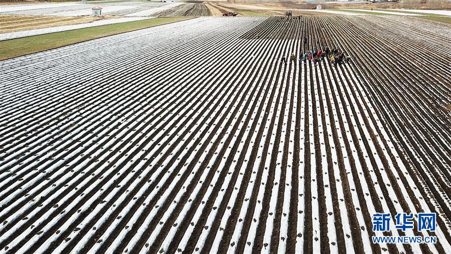 4月14日,向阳村薯菜套复种园区种植户移栽马铃薯(无人机照片)。 近日,黑龙江省兰西县兰西镇向阳村薯菜套复种园区开始移栽马铃薯。覆膜的黑土地呈现出黑白相间的美丽“线条”,种植户在“线条”中种下丰收的希望。该园区套复种主打品种是早春马铃薯和秋白菜,两茬作物平均每亩纯收入约3500元。 新华社记者 王建威 摄