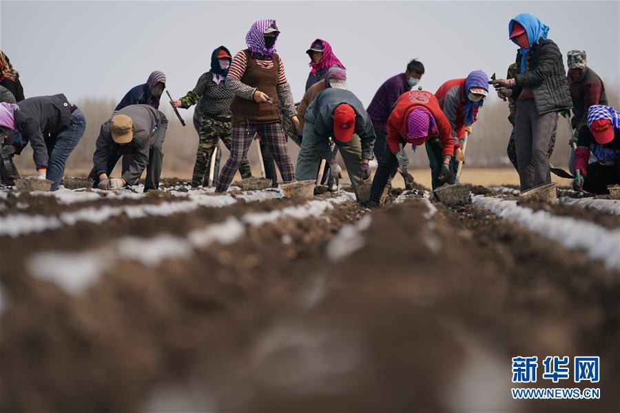 4月14日,向阳村薯菜套复种园区种植户移栽马铃薯。 近日,黑龙江省兰西县兰西镇向阳村薯菜套复种园区开始移栽马铃薯。覆膜的黑土地呈现出黑白相间的美丽“线条”,种植户在“线条”中种下丰收的希望。该园区套复种主打品种是早春马铃薯和秋白菜,两茬作物平均每亩纯收入约3500元。 新华社记者 王建威 摄