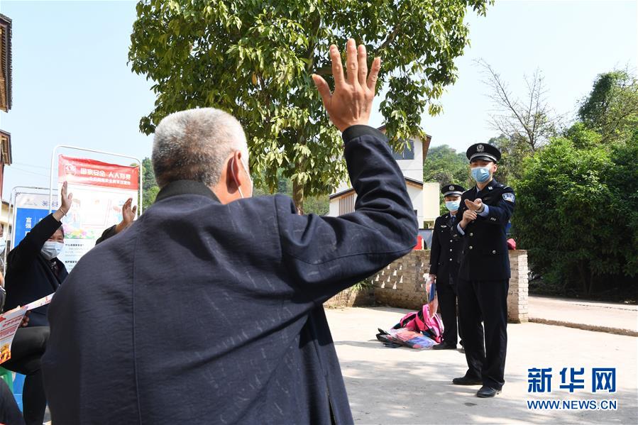 4月15日,在重庆市江北区复盛镇华山村,重庆铁路民警与村民进行互动问答。新华社记者 唐奕 摄