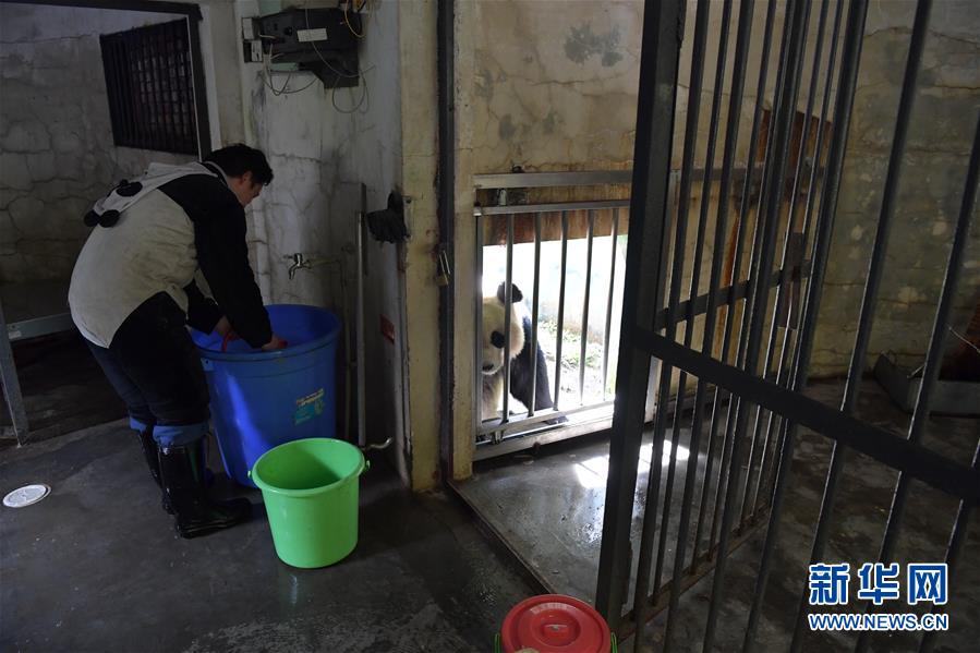 4月14日,中国大熊猫保护研究中心核桃坪基地饲养员周季秋在大熊猫“喜妹”的圈舍内打扫卫生。 新华社记者 张超群 摄