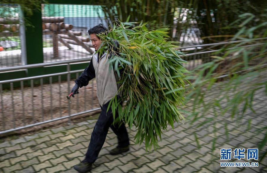 4月14日,中国大熊猫保护研究中心核桃坪基地的饲养员周季秋在准备供大熊猫食用的竹子。新华社记者 张超群 摄