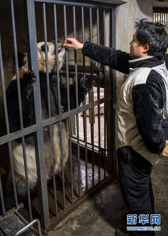 4月14日,中国大熊猫保护研究中心核桃坪基地饲养员周季秋用投喂窝窝头的方法训练大熊猫“喜妹”的下肢力量。 新华社记者 张超群 摄