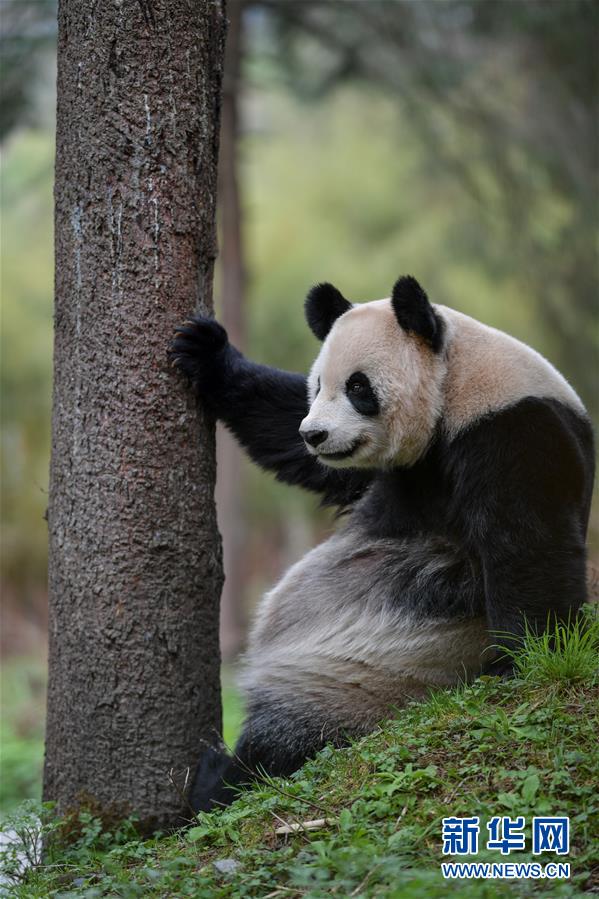 4月14日,大熊猫“喜妹”在中国大熊猫保护研究中心核桃坪基地活动场内。 新华社记者 张超群 摄