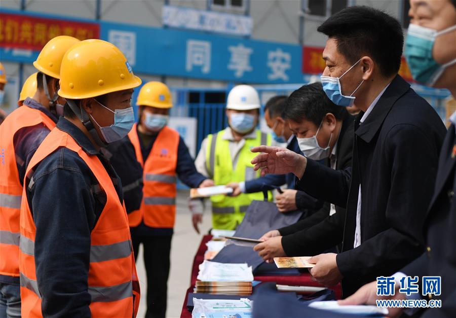 4月15日,在北京市东城区一处施工工地,工作人员向中建一局的工人发放《致农民工朋友的一封信》等宣传材料。 新华社记者 张晨霖 摄