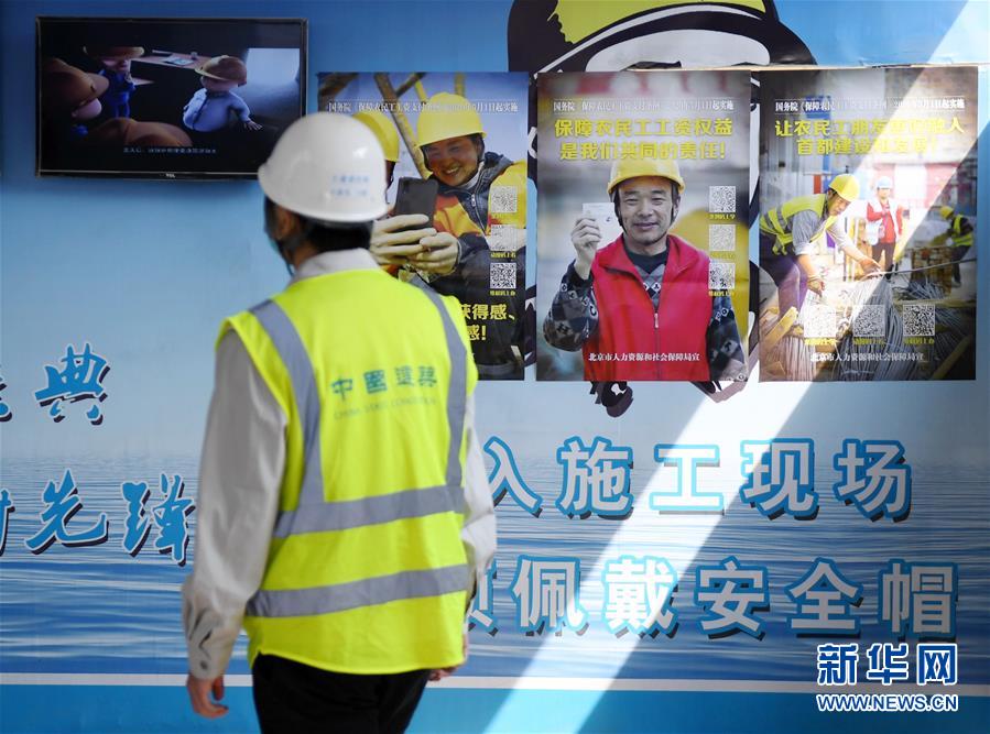 北京市东城区一处施工工地内张贴有《保障农民工工资支付条例》宣传海报(4月15日摄)。 新华社记者 张晨霖 摄