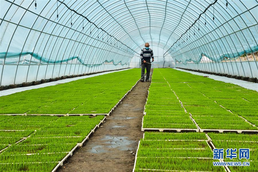 4月15日,太原市晋源区花塔村农民在大棚内喷洒营养剂。新华社发(柴婷 摄)