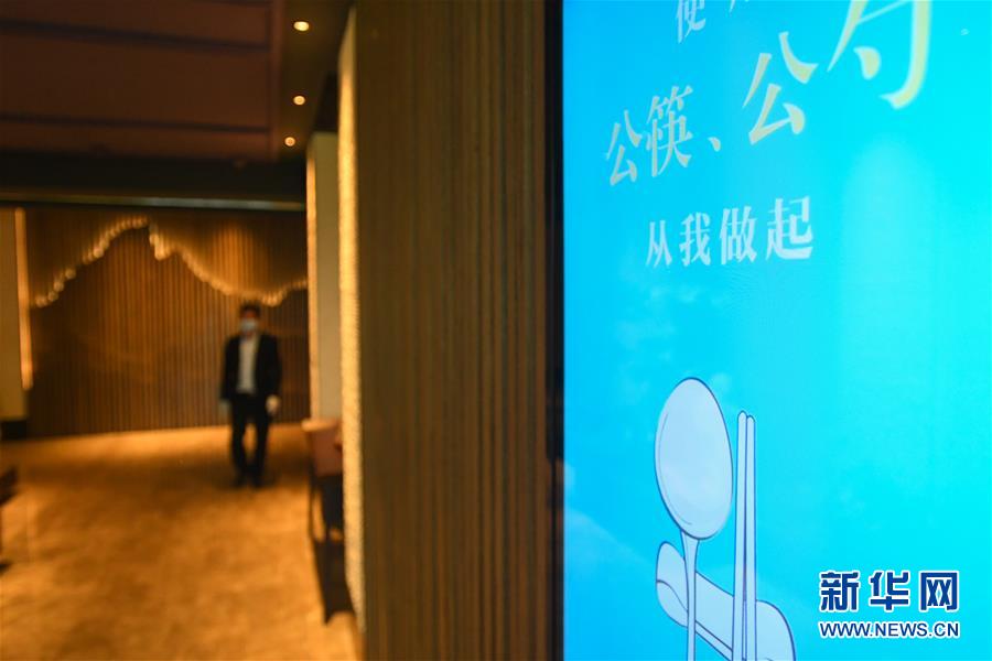 4月15日,在长沙市岳麓区一家湘菜餐厅,显示屏上播放公筷公勺宣传电子海报。新华社记者 陈泽国 摄