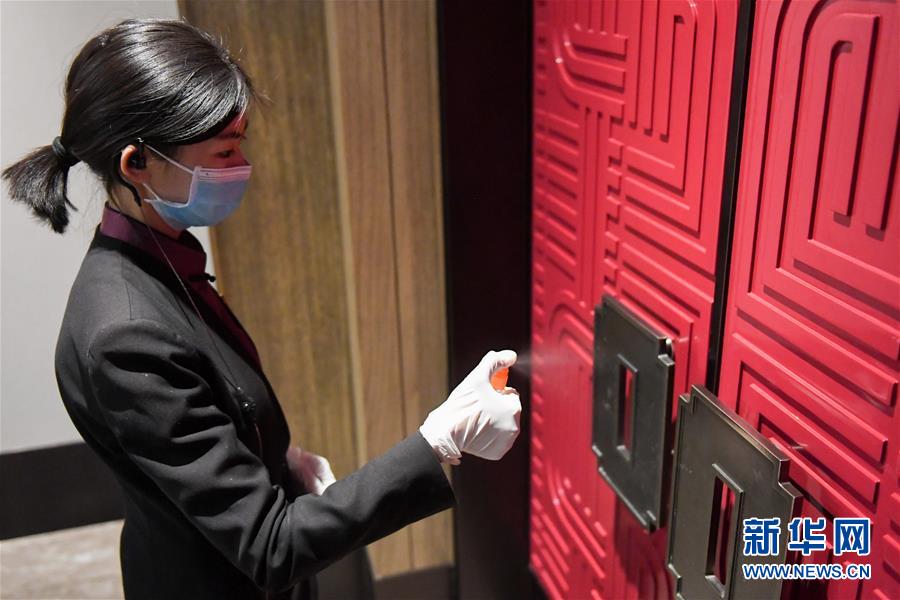 4月15日,在长沙市岳麓区一家湘菜餐厅,工作人员对门把手进行消毒。新华社记者 陈泽国 摄