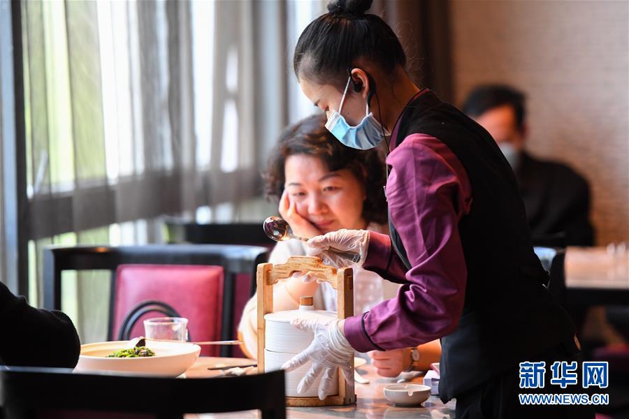 4月15日,在长沙市岳麓区一家湘菜餐厅,工作人员在上菜时准备了公勺。新华社记者 陈泽国 摄