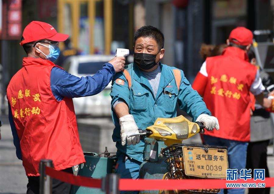 4月15日,武昌户部巷社区志愿服务人员在出入卡口为进入社区运送液化燃气的民生服务者测量体温。新华社记者 李贺 摄