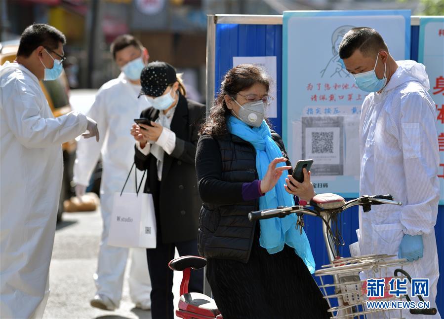 4月15日,值守在武汉市武昌楚材社区出入卡口的工作人员查看出入者的健康码。新华社记者 李贺 摄