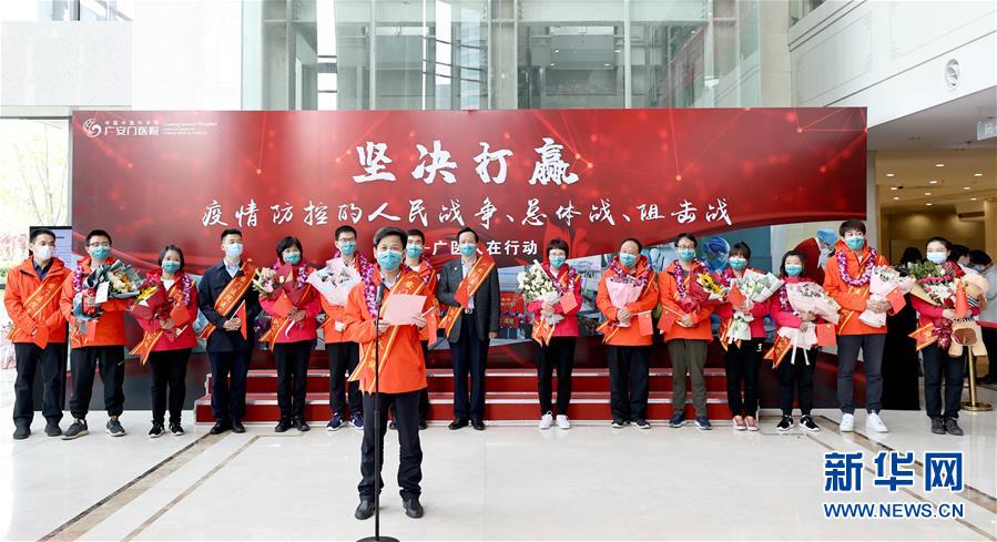 4月15日,广安门医院援鄂医疗队领队吕文良(前)代表医疗队汇报援鄂工作情况。新华社记者陈建力摄