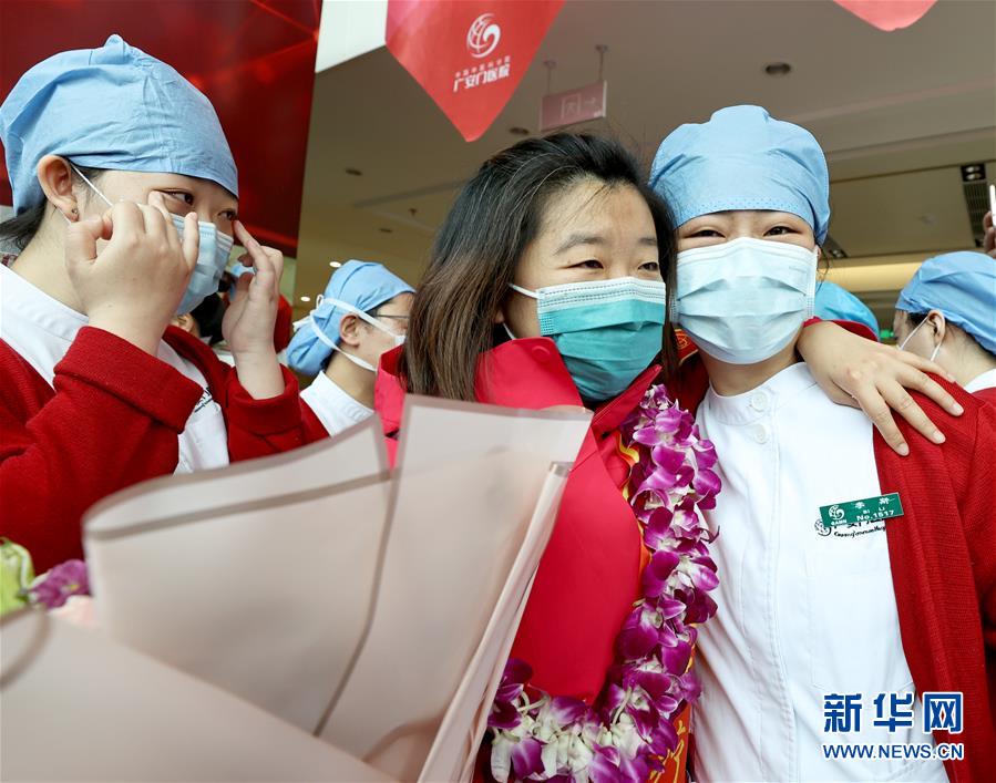 4月15日,广安门医院援鄂医疗队成闫蓓(中)和同事拥抱。新华社记者陈建力摄