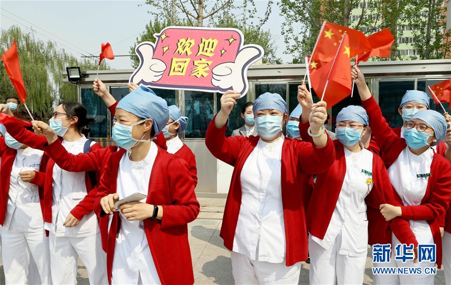 4月15日,广安门医院的医护人员在医院入口处欢迎援鄂同事返回。新华社记者陈建力摄
