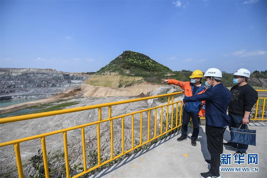 4月15日,东林镇安监部门执法人员(右一、右二)在康城石矿(湖州)有限公司查看矿山安全生产情况。 新华社记者 徐昱 摄