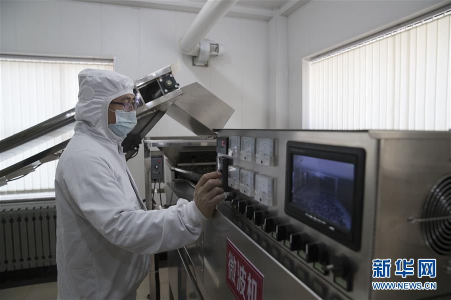 4月15日,黑龙江省维多宝食品股份有限公司工人在生产车间内操控机器加工木耳。新华社发(张涛 摄)