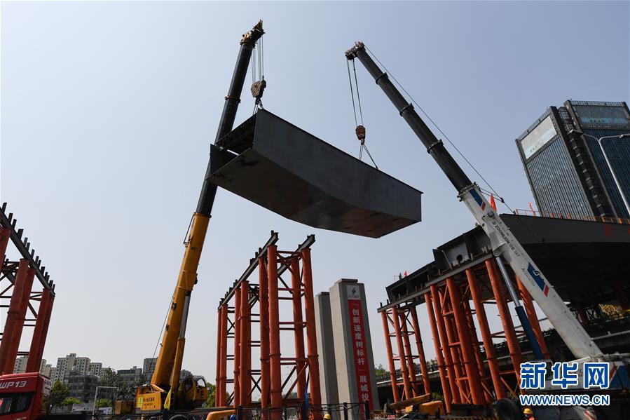 4月15日,施工人员在绍兴市329国道智慧快速路项目首个全线控制性工程现场对钢箱梁进行吊装作业。新华社记者 黄宗治 摄