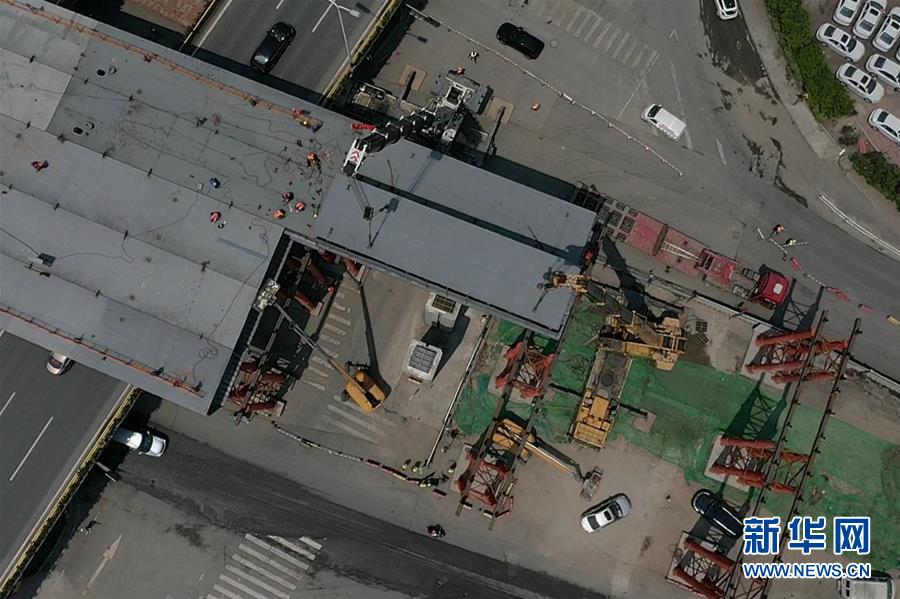 4月15日,施工人员在绍兴市329国道智慧快速路项目首个全线控制性工程现场对钢箱梁进行吊装作业(无人机照片)。新华社记者 黄宗治 摄