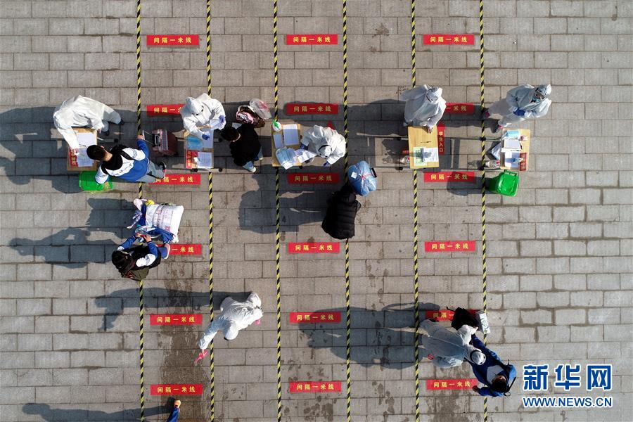 4月15日,在山东省临沂市郯城第一中学,工作人员为返校复课的高三学生测温消毒(无人机照片)。新华社发(房德华 摄)
