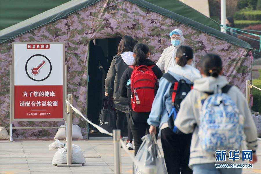4月15日,在山东烟台莱山一中,返校学生排队进入测温通道。新华社发(唐克 摄)