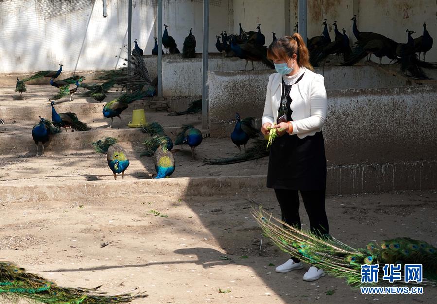 养殖户在洛阳市宜阳县一处孔雀养殖基地内给孔雀喂食(4月13日摄)。新华社记者 李安 摄