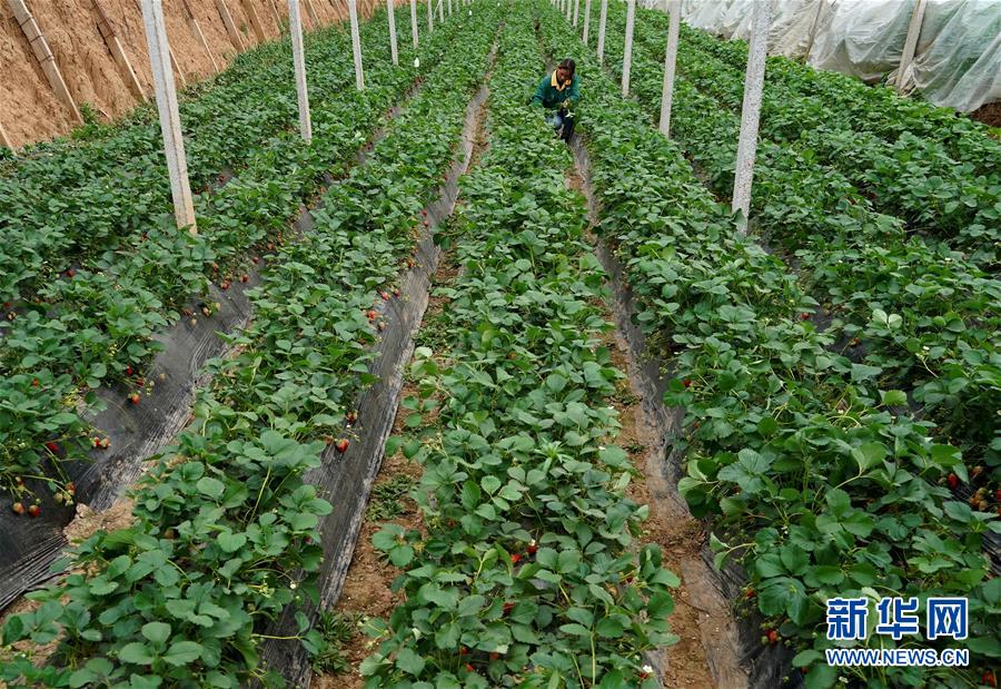 4月15日,工作人员在洛阳市伊川县江左镇一处草莓大棚内作业。新华社记者 李安 摄