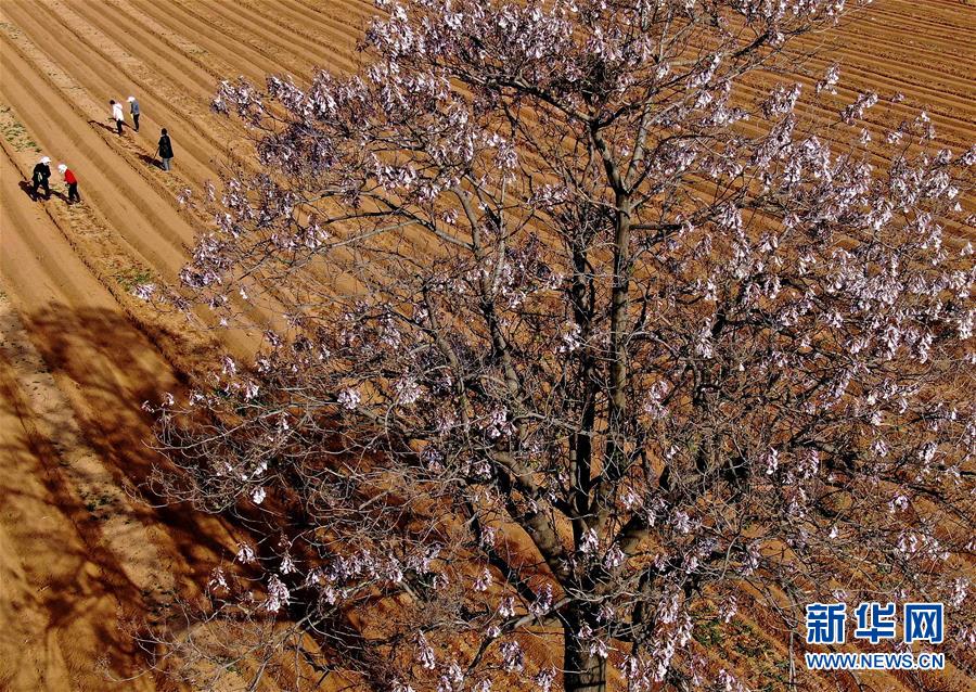 农户在洛阳市洛宁县小界乡一处农田里劳作(4月13日摄,无人机照片)。新华社记者 李安 摄