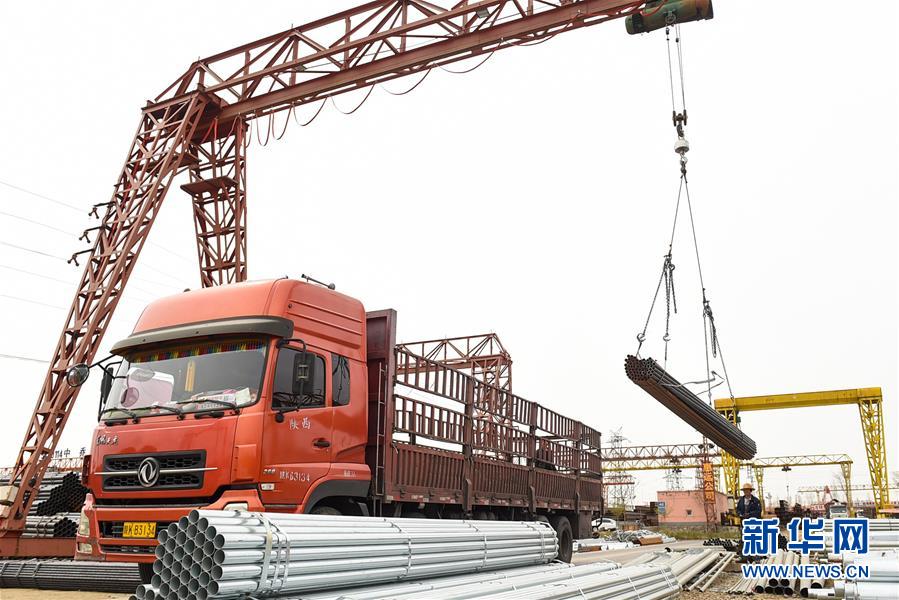 4月15日,包头鑫港源顺物流园的工人在卸运钢材。新华社记者 彭源 摄