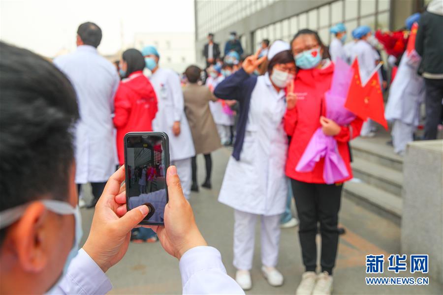 4月15日,中国医科大学附属第四医院援鄂医护人员(右)回到医院与同事合影。