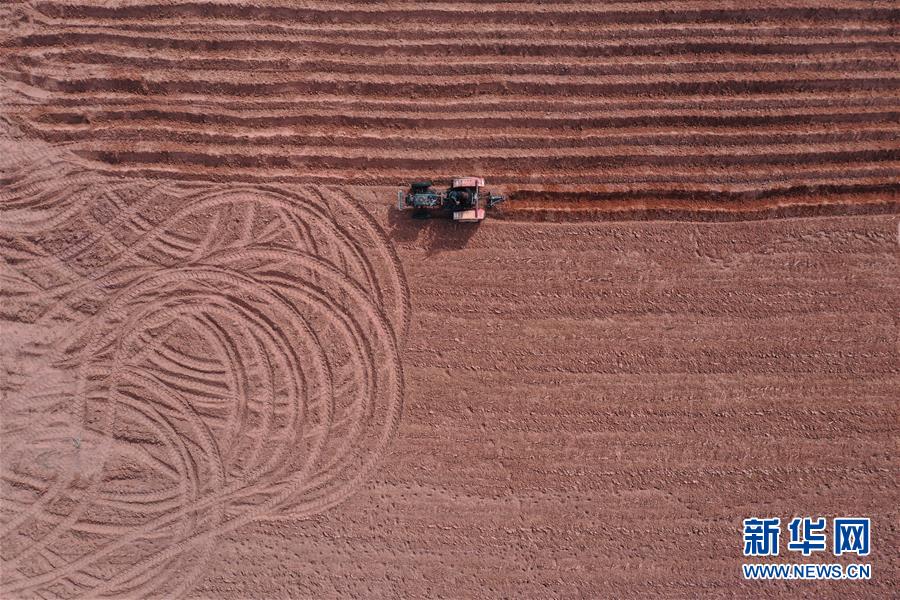 4月15日,农民操作机械在杭锦旗道劳呼都格嘎查的农田里翻地,为种植红葱做准备(无人机照片)。 春种时节,在内蒙古鄂尔多斯市杭锦旗道劳呼都格嘎查,农民忙着播种红葱。在鄂尔多斯高原种植的红葱耐旱耐寒,具有较好的经济效益。 新华社记者 徐钦 摄