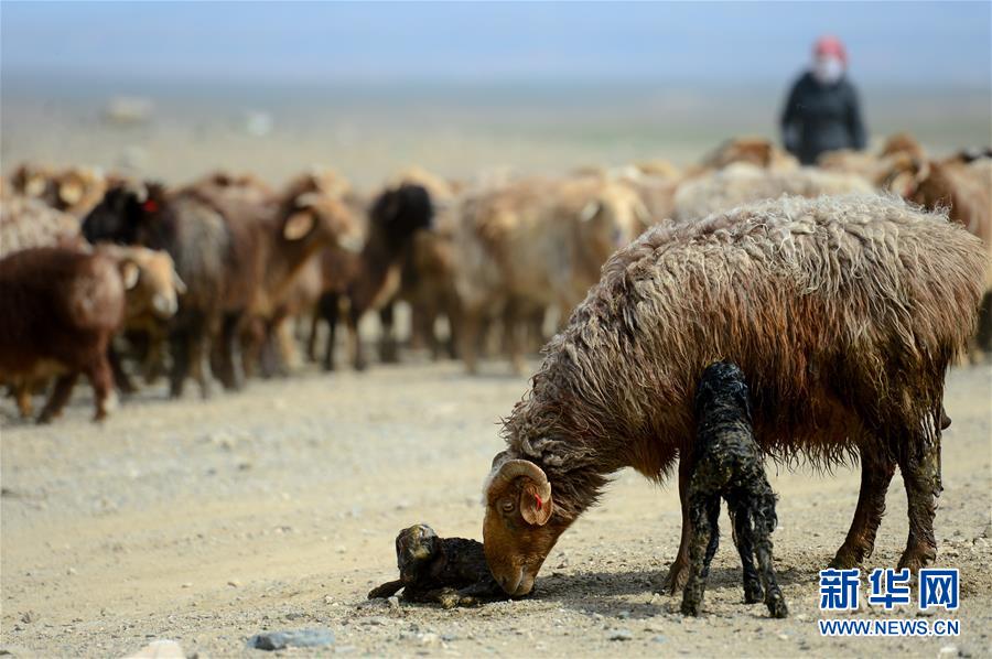4月15日,一只母羊在转场途中照顾刚刚产下的羊羔。 新华社记者 马锴 摄
