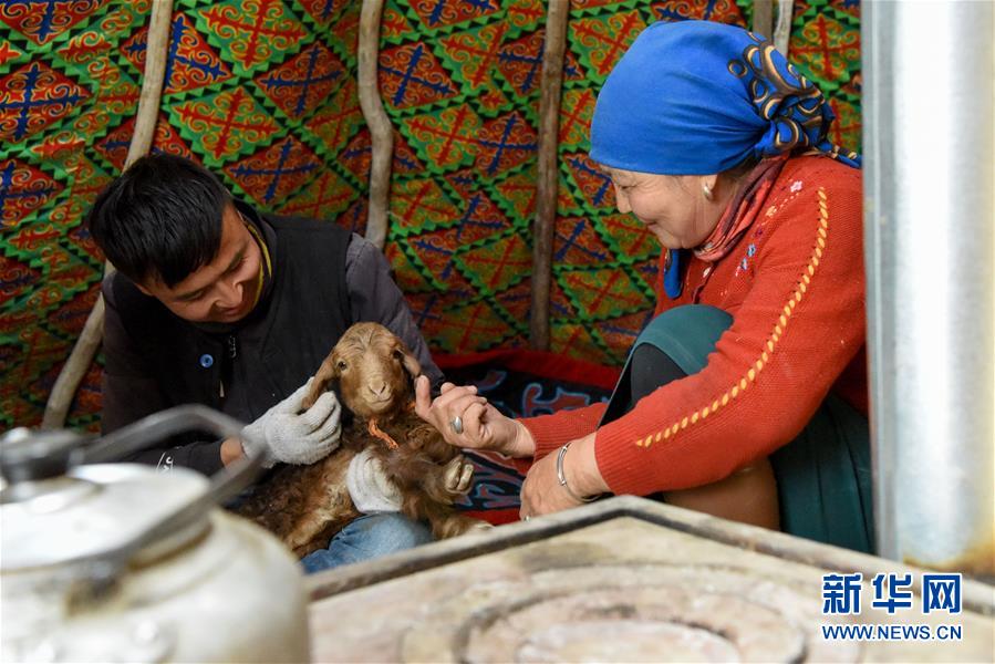 4月15日,转场牧民到达临时休息点,查看刚出生不久的羊羔身体情况。 新华社记者 丁磊 摄