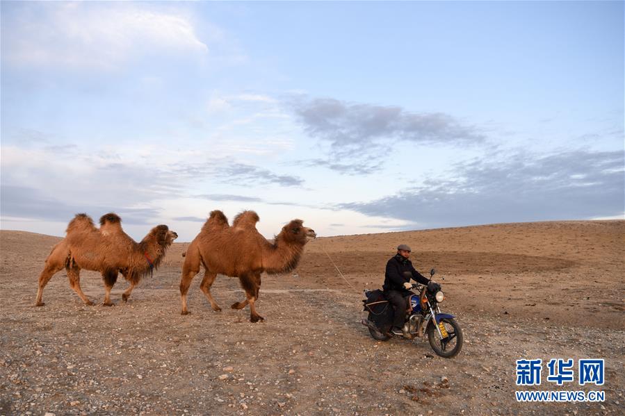 4月15日,新疆阿勒泰地区福海县牧民牵着骆驼行进在转场途中。 新华社记者 丁磊 摄