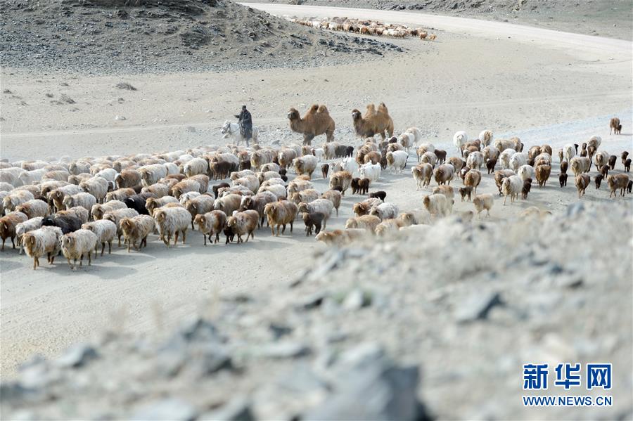 4月15日,新疆阿勒泰地区福海县牧民赶着牲畜向春秋牧场迁徙。 新华社记者 丁磊 摄