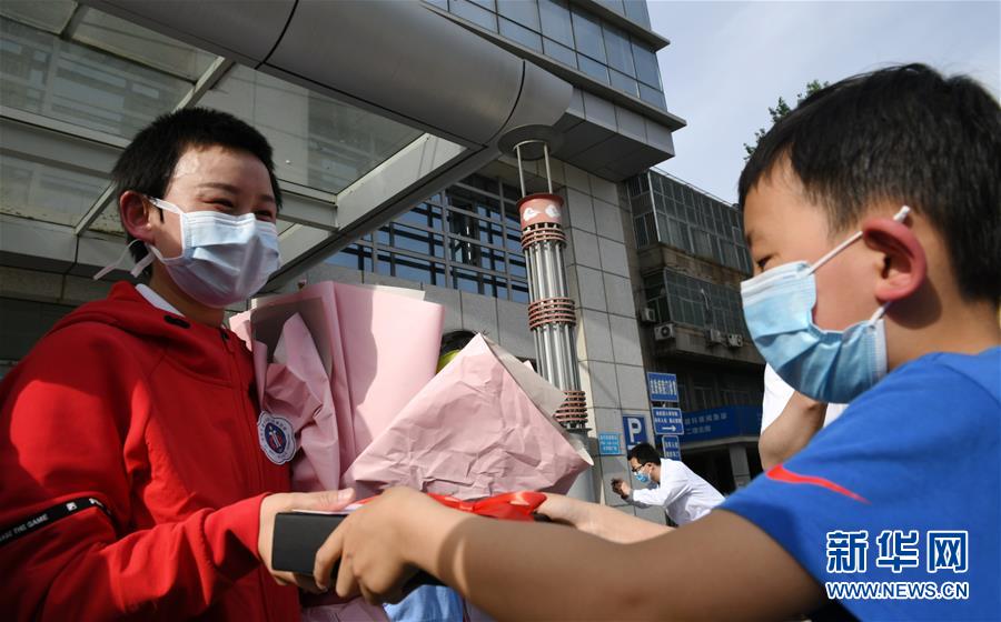 4月15日,西安交通大学第二附属医院援鄂国家医疗队队员韦飞(左)接过儿子鲁梓韦送上的礼物。 新华社记者 李一博 摄