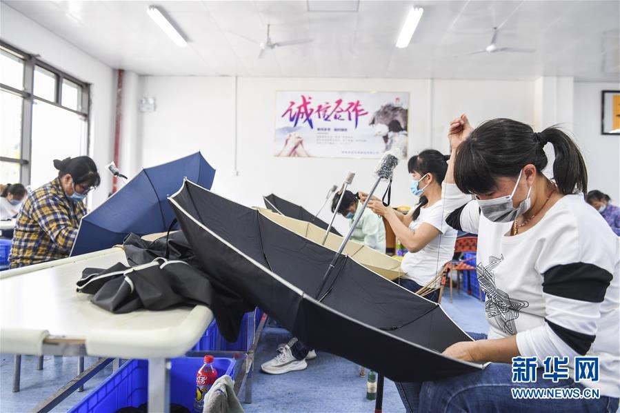 4月15日,搬迁群众在广西百色市田阳区易地扶贫搬迁安置点小区“老乡家园”内的扶贫车间工作。新华社记者 曹祎铭 摄