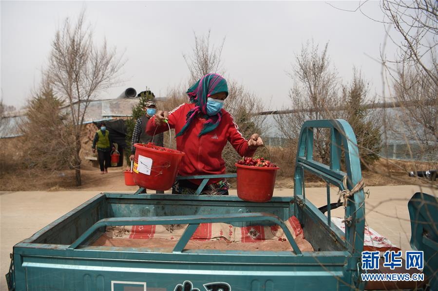 4月15日,在丰镇市爱优农场,工人将采摘的樱桃放进三轮车。 近日,在内蒙古乌兰察布市丰镇市爱优农场的大棚内,红红的樱桃挂满枝头。农场在做好疫情防控的同时,为贫困户提供就业岗位,有序开展樱桃采摘、分拣等工作,带动贫困户脱贫增收。 新华社发(李志鹏 摄)