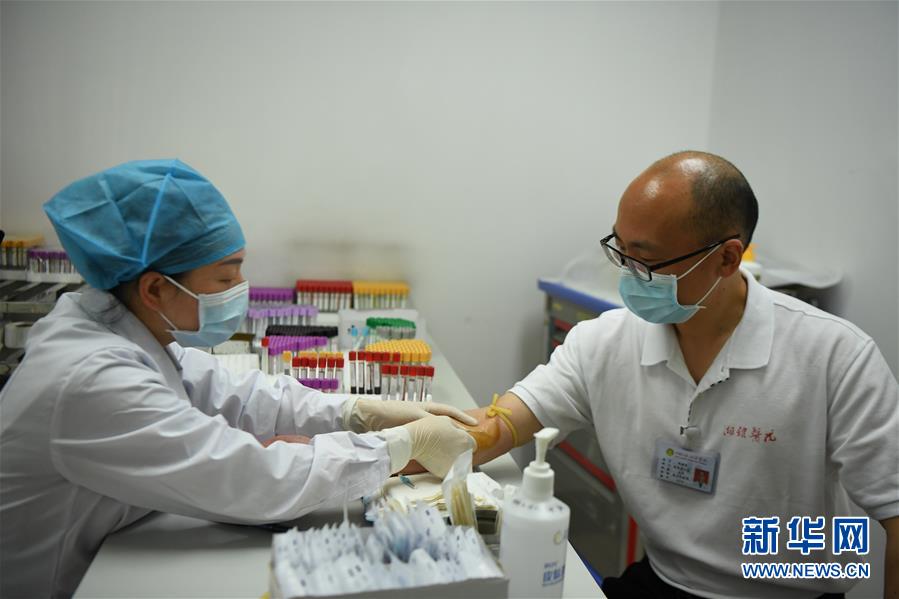 4月16日,中南大学湘雅医院援鄂国家医疗队队员钱招昕(右)在中南大学湘雅医院体检。 新华社记者 薛宇舸摄