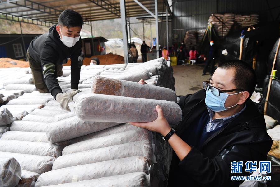 尹鹏先(右)与村民们一起码放香菇菌棒(3月5日摄)。 新华社记者 陶明 摄