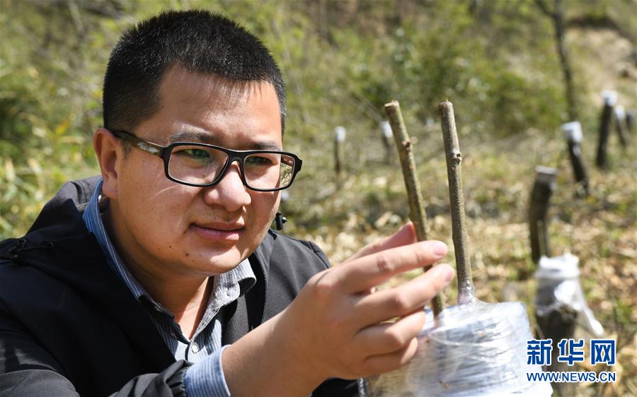 4月15日,尹鹏先在查看板栗林嫁接生长情况。 新华社记者 陶明 摄