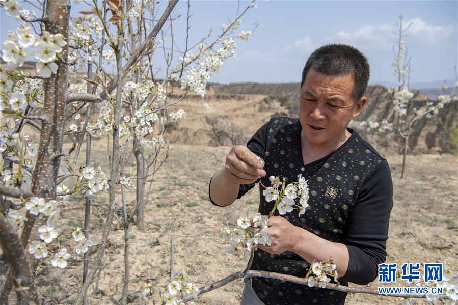 4月14日,峪里村村民马志明在梨园里查看梨花的生长情况。 新华社记者 杨晨光 摄