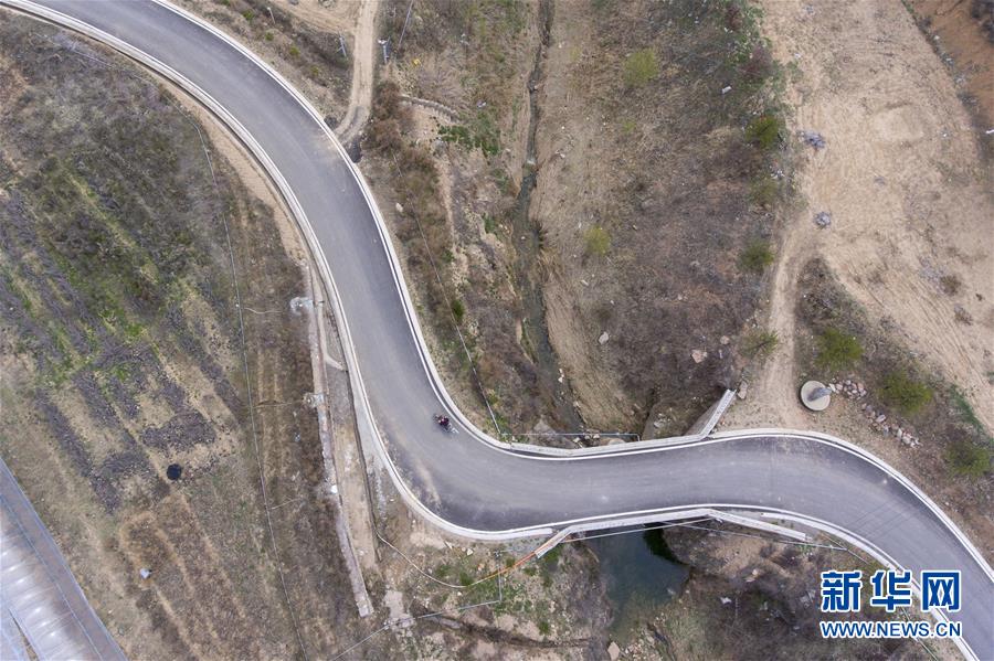 4月15日,一辆车行驶在峪里村改造后的柏油路上(无人机照片)。 新华社记者 杨晨光 摄