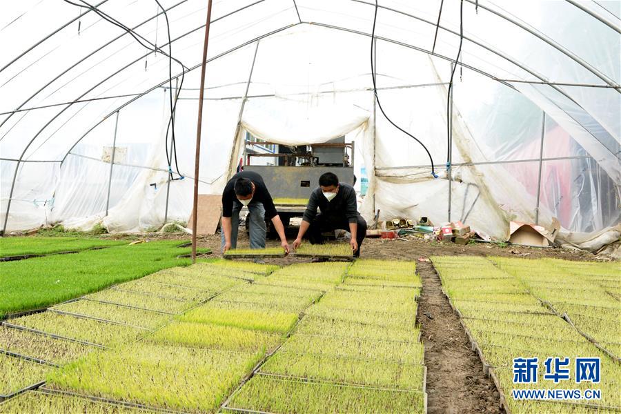 4月16日,肥东县禾丰专业合作社水稻育秧工厂的工作人员将催芽后的育秧盘摆放到大棚内进行育秧。新华社发(黄博涵摄)