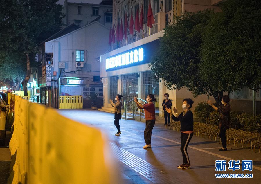 4月16日,市民在江汉区文化馆前锻炼身体。 随着武汉疫情防控形势好转,一些居民开始走出家门,戴好口罩,彼此拉开距离,用各种方式锻炼身体,不负大好春光。 新华社记者 肖艺九 摄