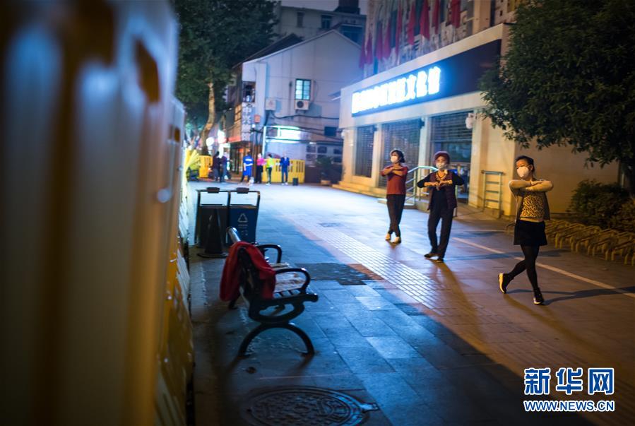 4月16日,市民在江汉区文化馆前锻炼身体。 随着武汉疫情防控形势好转,一些居民开始走出家门,戴好口罩,彼此拉开距离,用各种方式锻炼身体,不负大好春光。 新华社记者 肖艺九 摄