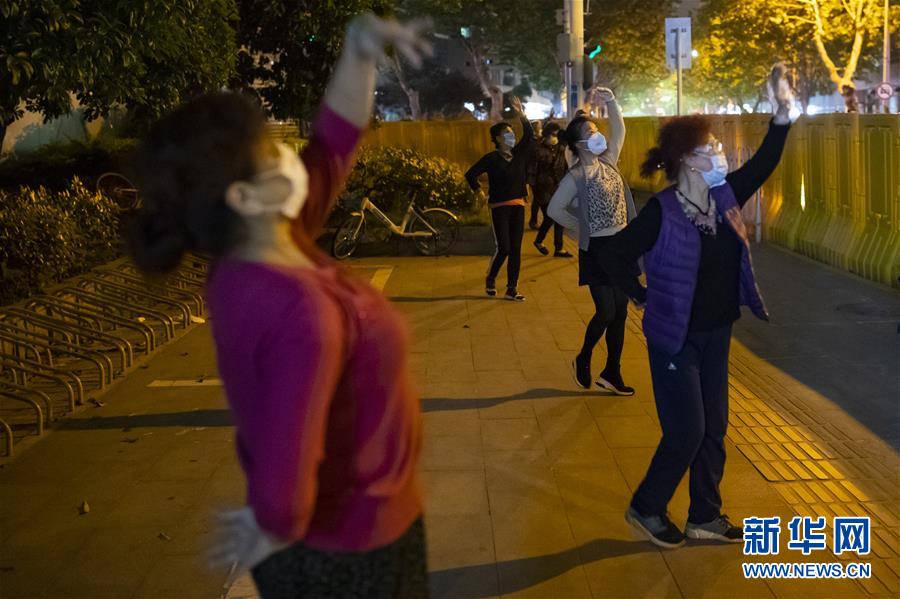 4月16日,市民在江汉区文化馆前锻炼身体。 随着武汉疫情防控形势好转,一些居民开始走出家门,戴好口罩,彼此拉开距离,用各种方式锻炼身体,不负大好春光。 新华社记者 沈伯韩 摄