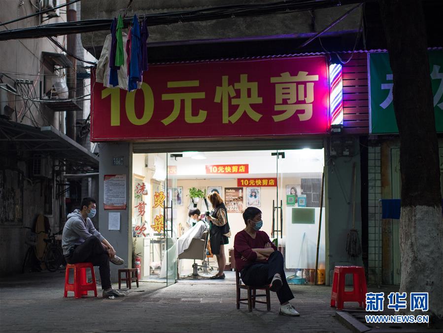 4月16日,在前进二路一家理发店,市民保持距离排队理发。 随着武汉疫情防控形势好转,店铺陆续开业,人们逐步复工复产,城市活力逐渐恢复。 新华社记者 肖艺九 摄