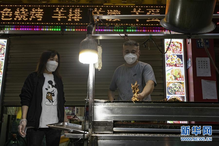 4月16日,烧烤店老板在制作烧烤。 随着武汉疫情防控形势好转,店铺陆续开业,人们逐步复工复产,城市活力逐渐恢复。 新华社记者 沈伯韩 摄