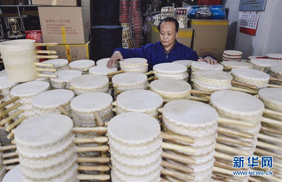 在延吉市民族乐器研究所,赵基德检查朝鲜族手鼓(4月14日摄)。新华社记者 许畅 摄