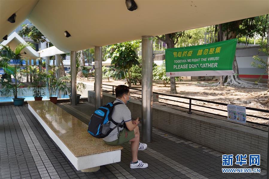 4月17日,香港市民在中环一处公园休息。 为控制新冠肺炎疫情,香港特区的卫生防疫机构在许多公共设施和空间张贴告示,提醒公众“同心抗疫,请勿聚集”。 新华社记者 吕小炜 摄